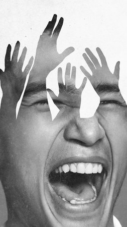 Modern artwork. Man laughing, mouth wide, layered with reaching hands, expressing joy and unity while acknowledging shared societal struggles. Concept of human emotions, social issues, sport fans. Ad