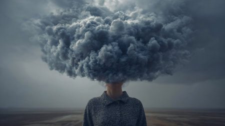Surreal black and white concept man with cloud over head. smoky cloud in front of person head