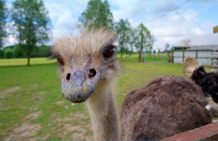 Ostrich with a long neck. Ostrich farm in the fresh air