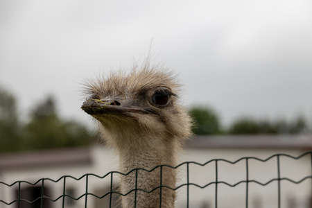 Ostrich head close-up. Sad ostrich in the pen. Birds on an ostrich farm. Farming and poultry farming. Breeding of agricultural birds.