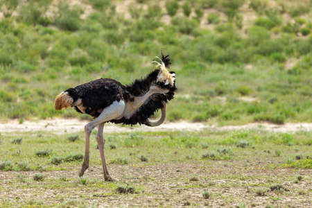 Ostrich, Struthio camelus in green Kalahari, desert after rain season. Kalahari Transfrontier Park, South Africa wildlife safari