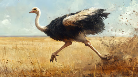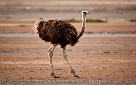 A large ostrich is walking on a sandy surface. The bird is the main focus of the image, and it is walking towards the camera. The setting creates a sense of tranquility and natural beauty