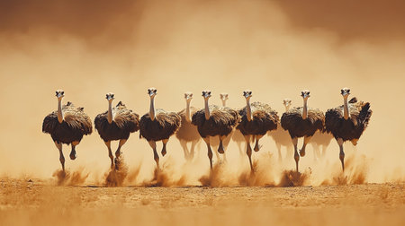 A group of ostriches walking gracefully across the golden savanna, with scattered palm trees and a clear blue sky creating a picturesque African landscape.