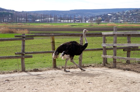 Ostrich with a long neck. Ostrich farm in the fresh air