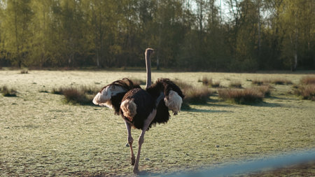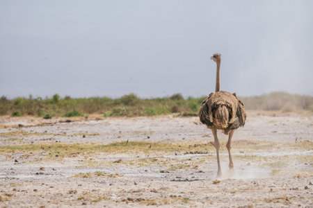 Three Masai ostrich walking and dancing Amboseli National Park in Kenya Africa