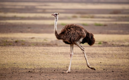 Male African Ostrich bird with thick long bare legs walking in open grassland at Serengeti National Park in Tanzania, East Africa