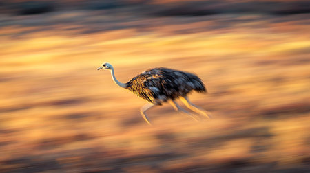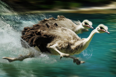 Two ostriches sprint rapidly across the water, creating splashes and showing their agility.