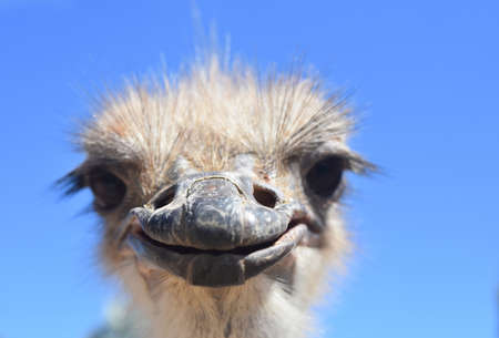 Ostrich head close-up on blue sky background. Portrait of ostrich