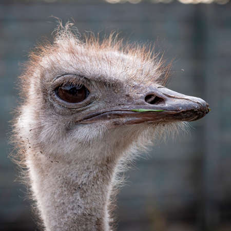 Gray ostrich looking at the camera. Farm animal. Close-up photo.