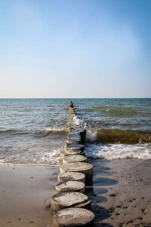 Wooden piles (groynes) that rise from the sands of the Baltic sea protect the beach and the coast