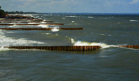 Embankment Zelenogradsk. Baltic Sea. Surf. Wooden logs of a breakwater. Kaliningrad