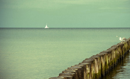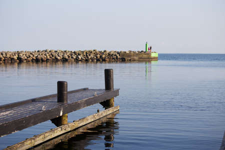 maritime background, wooden breakwater in calm baltic sea against blue sky