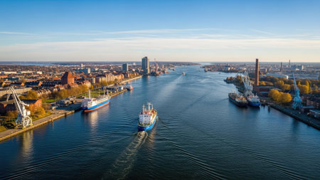 night view of canal with ships and Baltic Sea in Warnemunde, Rostock Germany