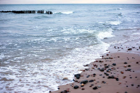 Baltic Sea in evening. Surf and soft waves, calmness and reclax. Beautiful nautical design, selective focus.