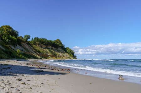 Baltic coastline. Escarpment slope lead to pebble beach. People walking along the shore hanseatic City of Luebeck - Travemuende, Germany