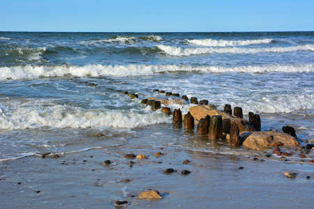 Seaside of Baltic Sea in Poland. White manes of waves hit wooden broken poles.