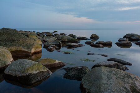 Beautiful long exposure landscape of rocky sea shore. Tranquil scene of Baltic sea.