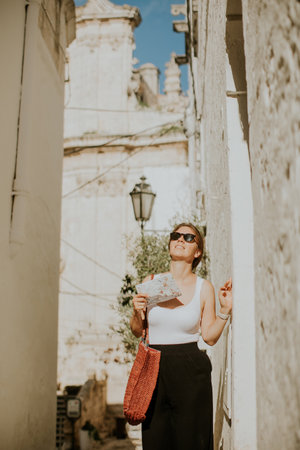 Female tourist with a paper city map on narrow streets of Ostuni, Italy