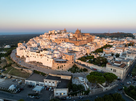 Aerial view of Ostuni white city in Puglia, Italy at sunset.