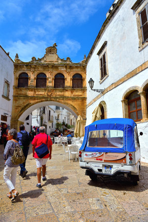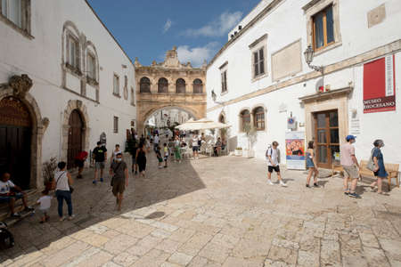 OSTUNI, ITALY - JULY 27, 2011: Unidentified people in the old town near the Arch Scoppa (Italian: Arco Scoppa).