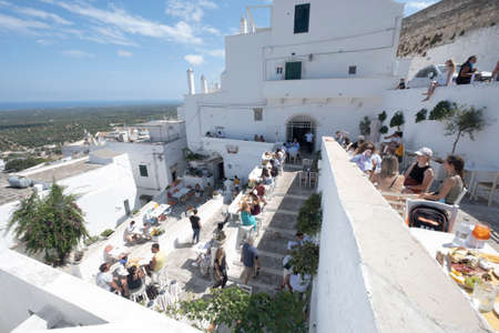 tourists enjoying drinks in Ostuni restaurant of old town with wonderful panorama, Ostuni, Italy