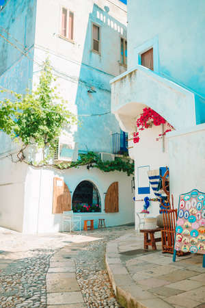 The narrow streets of the island with blue balconies, stairs and flowers.