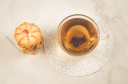 Breakfast whith cookies and glass cup whith tea/Breakfast whith cookies and glass cup whith tea on a white table. Top view