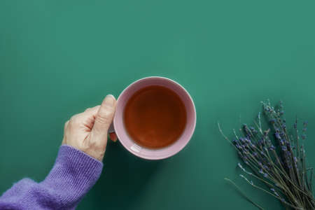 Dry Lavender flower bouquet and hands with cup.