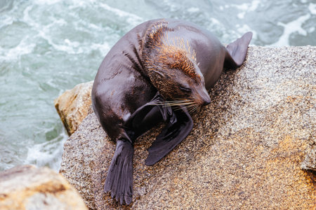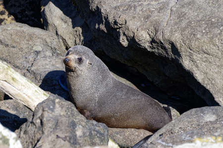 A New Zealand fur seal is dry, it has been sunning itself on the warmth of the rocks.