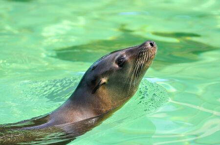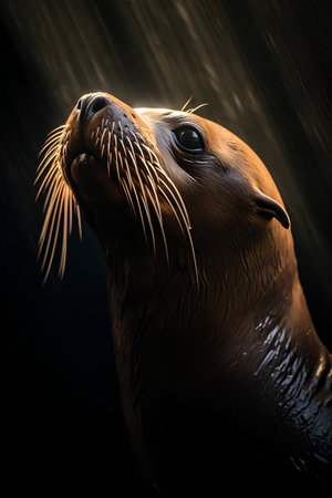 The sea lion is swimming with its head above water. Image generated with Generative AI
