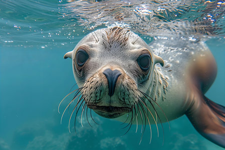 A sea lion is swimming underwater, its face close to the camera showing an expression of curity and wonder as it gazes at something in front or above the water surface. the clear blue ocean is visible behind with gentle ripples on top. this shot captures the majestic presence of marine life at human