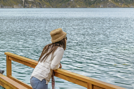 QUILOTOA, ECUADOR, FEBRAURY - 2016 - Young woman contemplating the view at Quilotoa lake, Latacunga, Ecuador