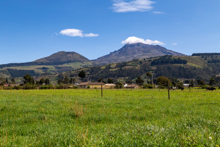 Ilinizas Volcano, Andean landscape with its crop fields and mountains showing their greenery on a clear morning, south eastern view.