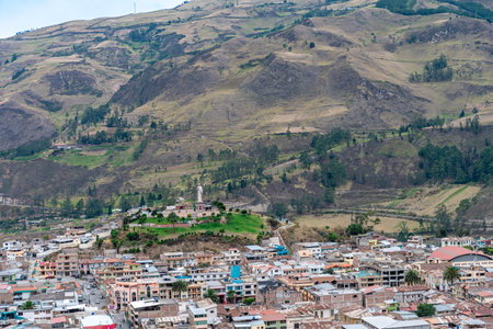 View of downtown Guaranda, with it's cathedral and central buildings, surrounded by the Andes mountains, on a sunny morning.
