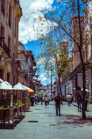 Calle Espejo, Quito, Pichincha, Ecuador, September 19, 2019. Tourists walking through a picturesque pedestrian street in Quito Ecuador
