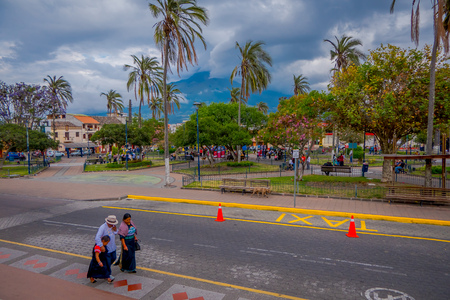 COTACACHI, ECUADOR, NOVEMBER 06, 2018: People in Calderon Park, Cotacachi, Ecuador, in front of Matriz Church
