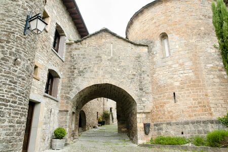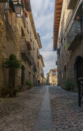 Street with stone houses in the medieval village of Ainsa in the pyrenees, Aragon, Spain