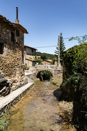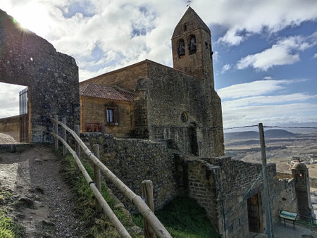 Beautiful old church of stone in Merindades. Blue sky with clouds, Burgos, Spain, Europe.