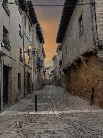 A scenic historic street in Briones, La Rioja, Spain, with traditional stone buildings and a beautiful sunset sky.