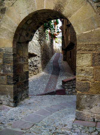 Old stone houses and narrow cobblestone streets in a picturesque medieval village of Ujue in the Basque Country, Navarra, Spain