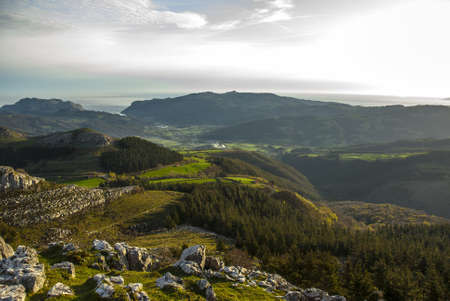 Sunset landscape with big overhung rock and roofs in Ares, Spain.
