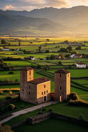 Warm sunlight casts a golden glow over a quaint village nestled on a hillside, with terraced fields and lush vineyards surrounding it during sunset.