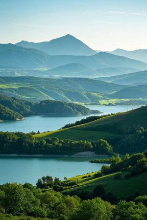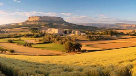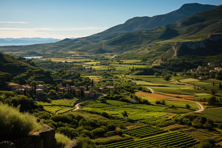 Generative AI : Panoramic Aerial view of a peaceful agricultural field in the middle of green mountain hills with a clear blue sky Calles Valencia Spain