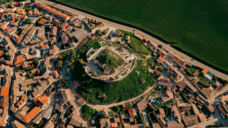 Panoramic view of the historic town of Astudillo, Spain, showing the medieval La Mota Castle and traditional hillside wineries. Captures rural charm and architectural heritage.