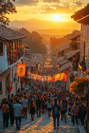 an Inti Raymi procession on cobblestone streets, participants carrying banners and symbols of the sun