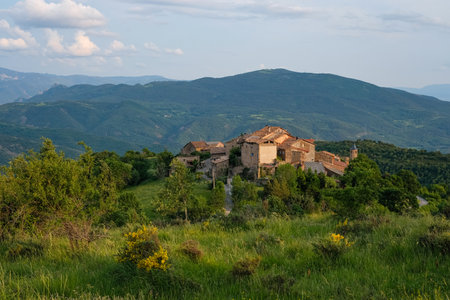 Small village in the Vall Fosca, Catalonia, Pyrenees. Historical heritage of the Vall Fosca. Unknown tourism. Escaping mass tourism. Golden evening hour. Copy space.