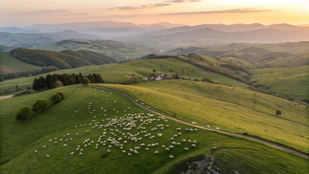 Aerial view of sheep herd grazing on green meadow in Carpathian mountains