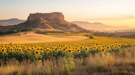 A breathtaking view of Lovers' Rock at sunrise, with a vibrant field of sunflowers at its base, creating a beautiful, tragic scene in Antequera.