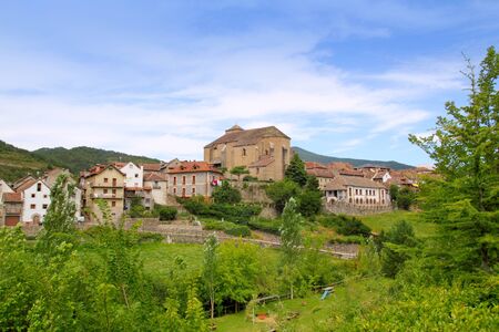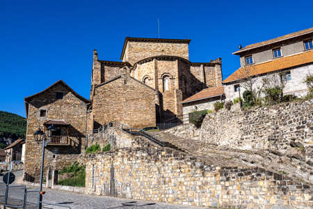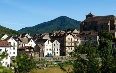 Hecho village Pyrenees with Romanesque church cathedral in Aragon Spain