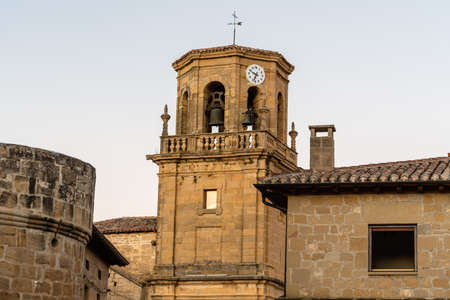 Santa Maria la Mayor Church with its bell tower and medieval stone walls in San Vicente de la Sonsierra, Spain, under a cloudy sky with sunlight.